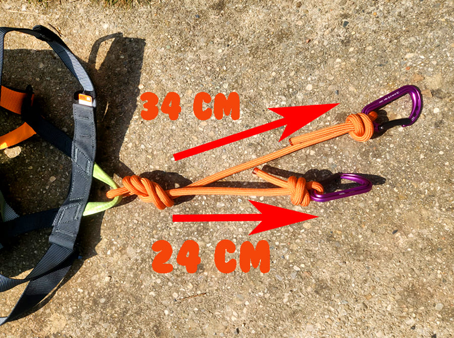 Pour obtenir une longe double finale de 54 cm et 64 cm, coupe une corde de 2m14.